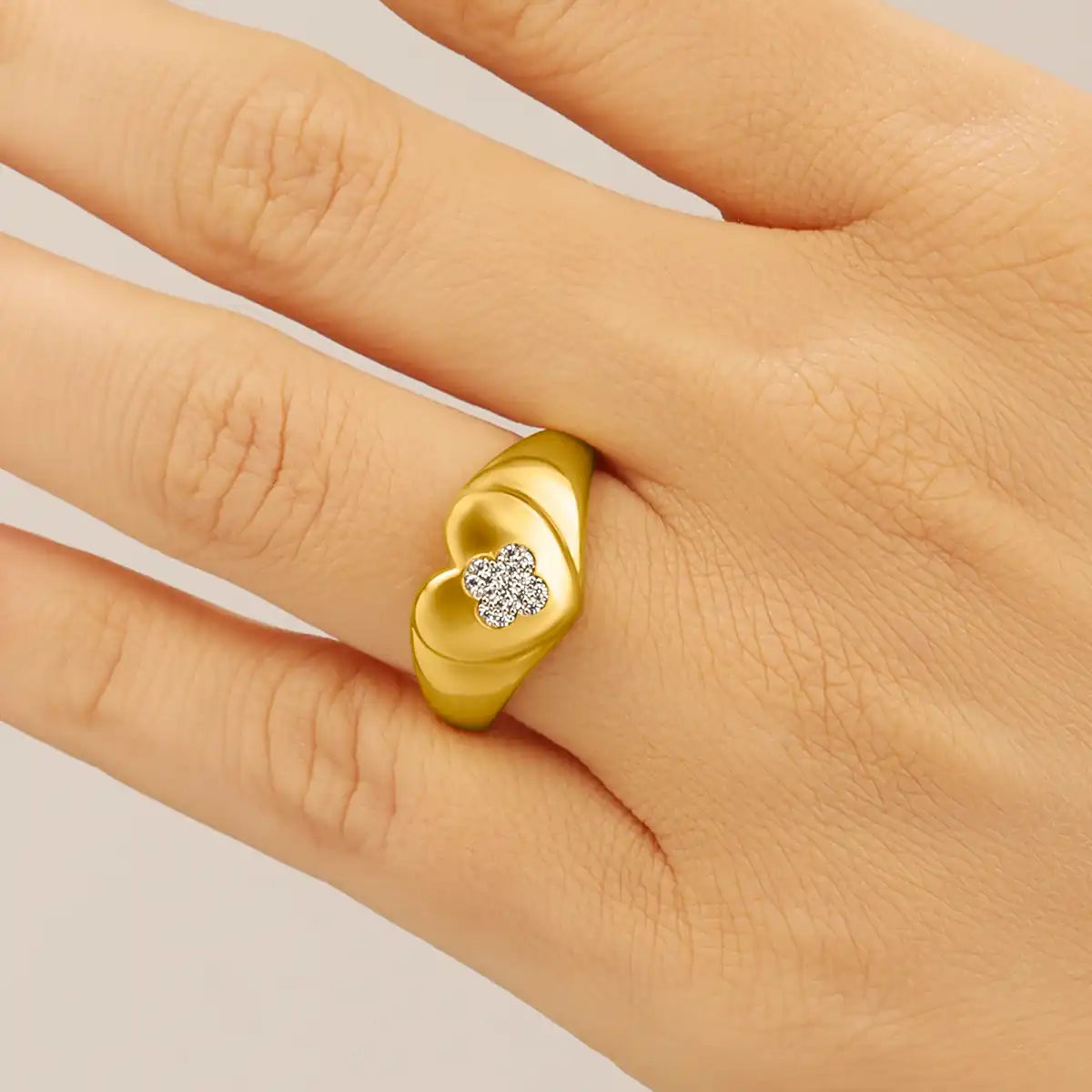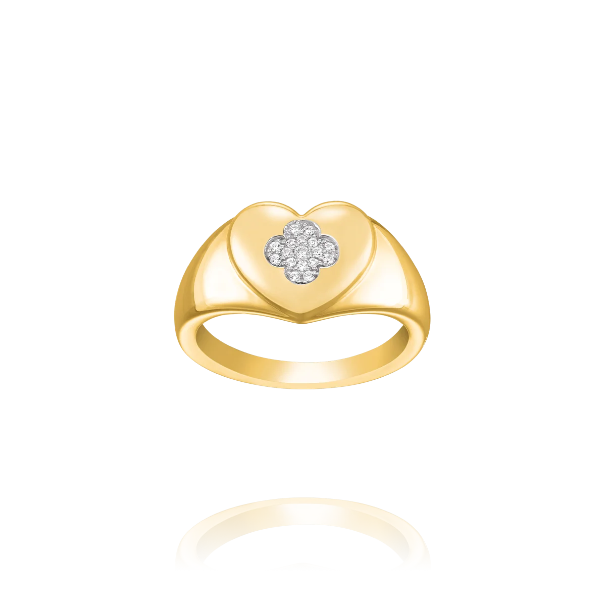 Inspirée de la collection Passion, cette bague en argent doré est un véritable chef-d'œuvre. Elle présente un cœur et un trèfle harmonieusement entrelacés, rehaussés d'éclats étincelants d'oxydes de zirconium. Avec un poids de 4,95 gr., elle combine solidité et raffinement.