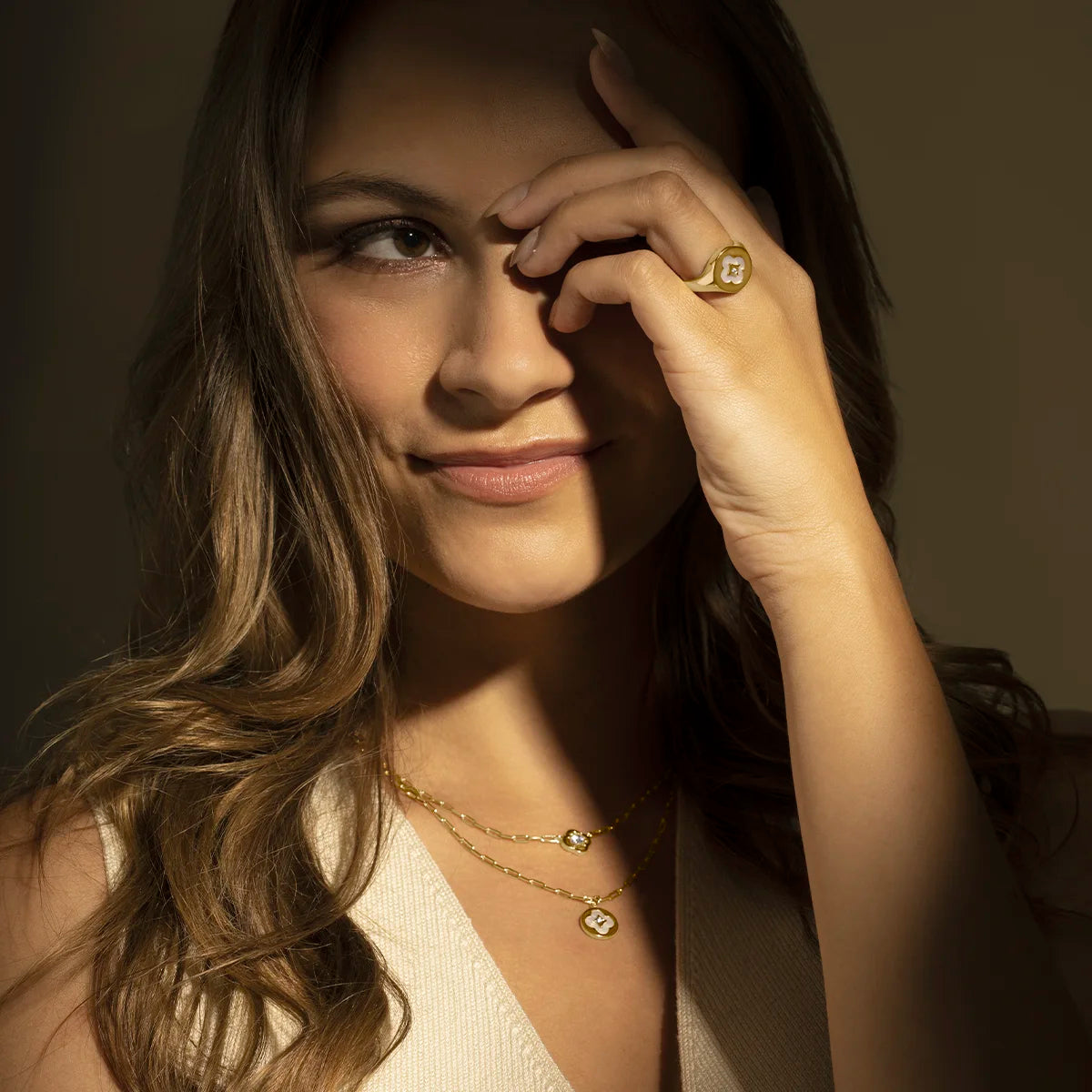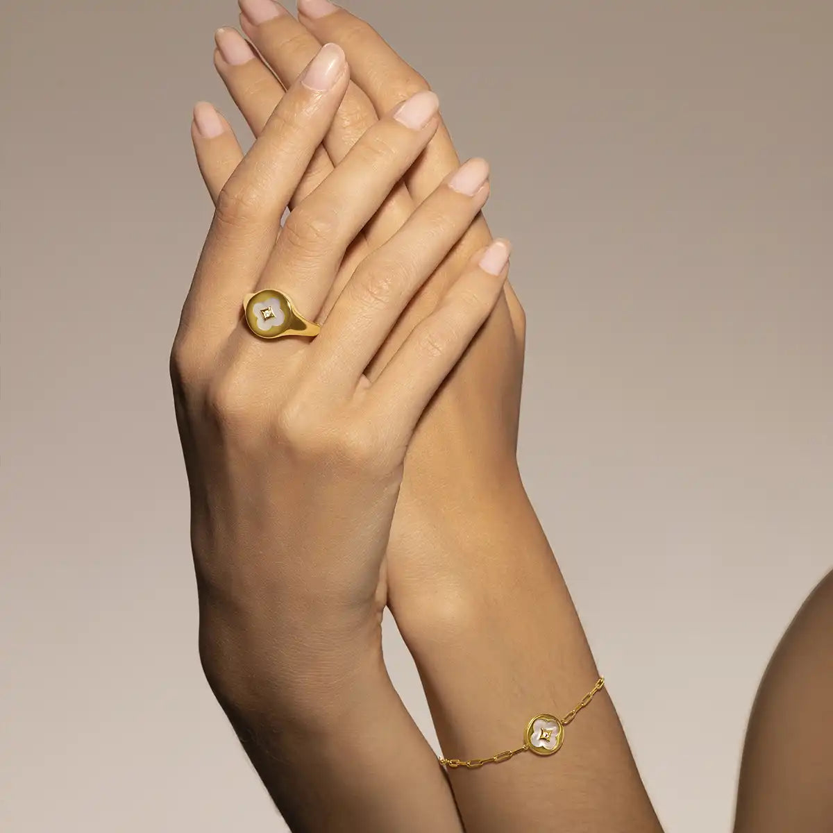 Accueillant en son centre le fameux trèfle Garnier en nacre blanche serti dans une médaille d'argent 925 doré cette bague sublimera votre main avec élégance et discrétion.