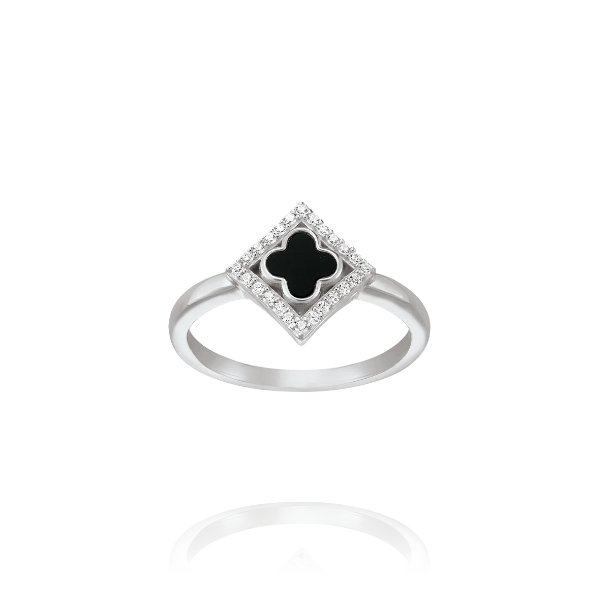 Affirmez votre siophistication jusqu'au bouts des doigts avec la Bague Losange & Trèfle LÉGENDE. Une création précieuse en argent 925 ornée d'oxydes de zirconium. Le losange, symbole de perfection, encadre un trèfle en agate noire, porteur de chance et de protection. Cette bague élégante reflète parfaitement la féminité et magnifie chaque geste d’un éclat raffiné. La Bague Losange & Trèfle LÉGENDE est un bijou luxueux, idéal pour compléter une parure de bijoux, tout en révélant une touche de mystère et de grâce.