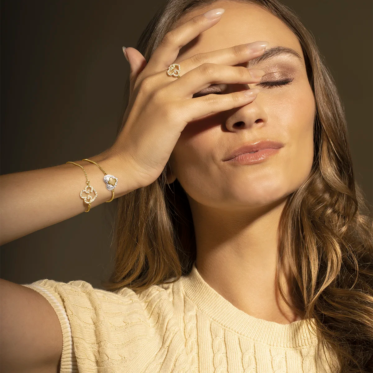 Déclarez votre style avec la Bague PASSION de Charles Garnier Paris, une création audacieuse qui unit l'amour et la chance. Cette bague en argent doré est ornée d'un motif original, à la fois mi-cœur et mi-trèfle, symbolisant l'harmonie des sentiments. Ses contours ajourés sont finement sertis d'oxydes de zirconium scintillants, apportant une brillance éclatante à ce design poétique.