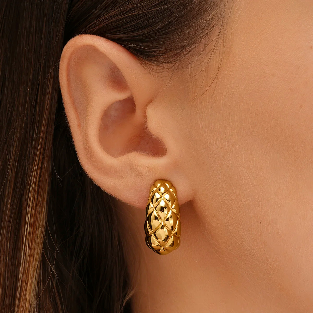 En argent 925 doré au design matelassé, ces boucles d'oreilles très légères au porté sauront vous séduire. Le fermoir tige-raquette assure une pleine sécurité de ce bijou électroformé.