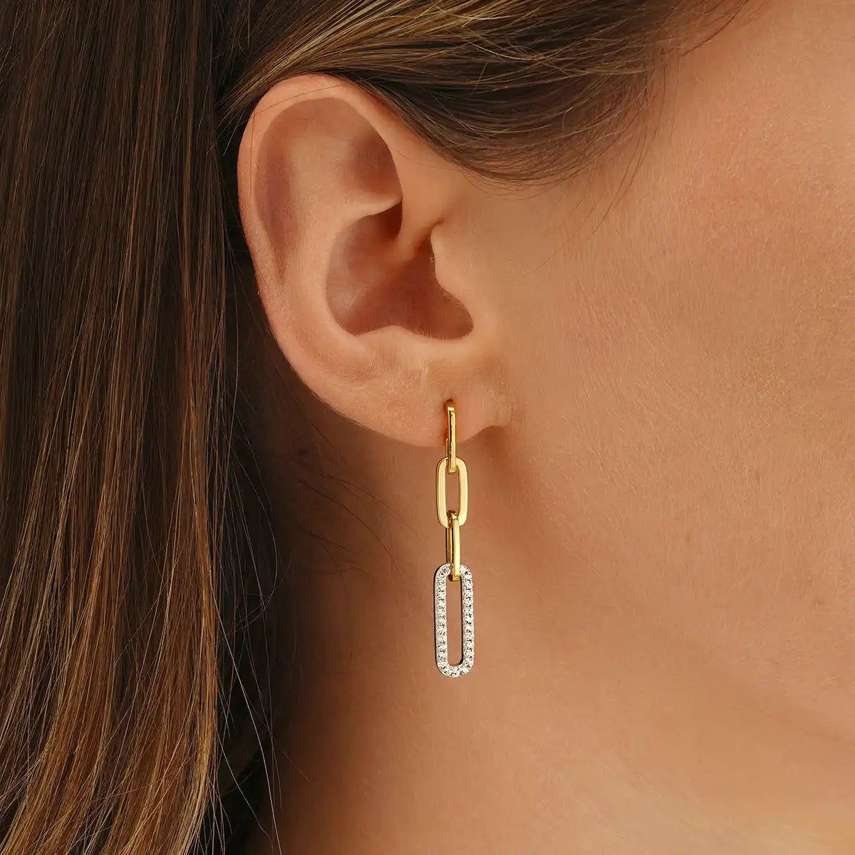 Ces boucles d'oreilles pendantes tout en argent 925 bicolore sont composées de 3 maillons dont le plus important est serti d'oxydes de zirconium. Un classique élégant à porter en journée ou en soirée.