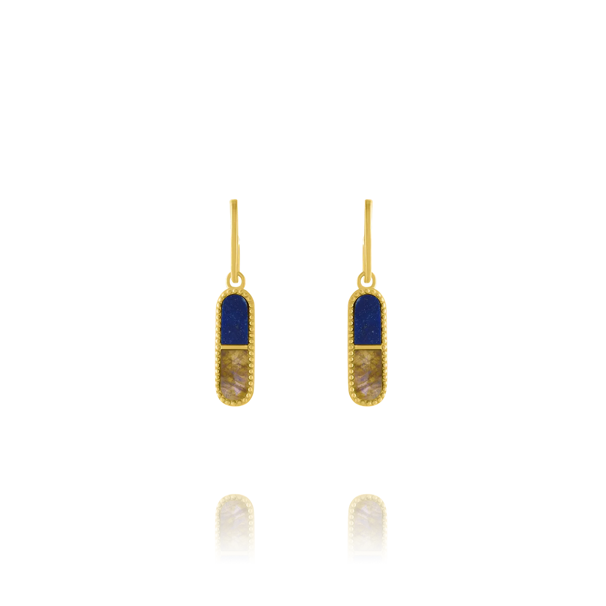 Distinguées et raffinées, ces boucles d'oreilles ovales de la collection Styles associent harmonieusement le bleu profond du lapis-lazuli à la douceur de la nacre, le tout entouré d'argent doré.