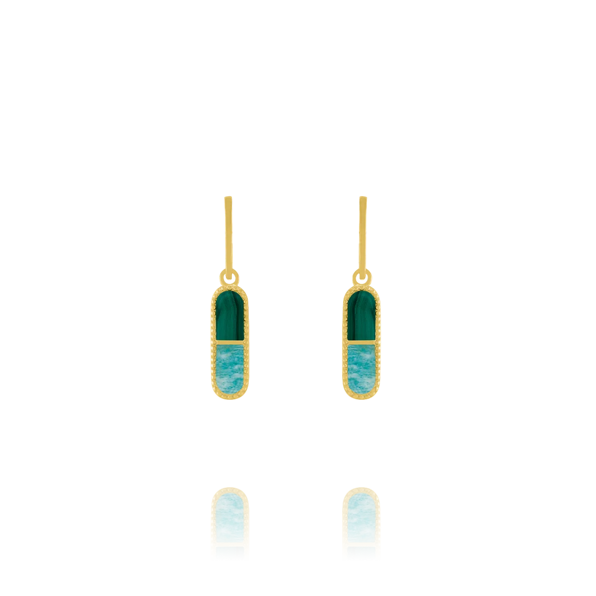 La collection Styles présente ces boucles d'oreilles ovales, où la malachite verte se mélange harmonieusement à l'amazonite bleu turquoise, toutes deux encadrées par de l'argent doré.