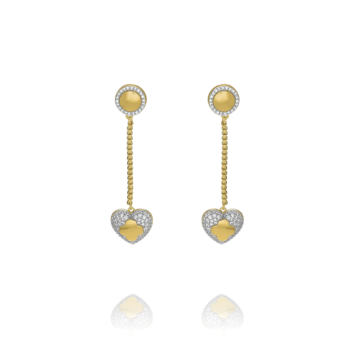 Les Boucles d’oreilles pendantes PASSION incarnent l’alliance parfaite entre raffinement et éclat. Conçues en Argent doré, elles se distinguent par un jeu de contrastes entre la douceur du métal et l’éclat des oxydes de zirconium. Une attache circulaire pavée de zircons se prolonge en une fine chaîne, menant à un pendentif cœur sublimé par un motif trèfle doré.