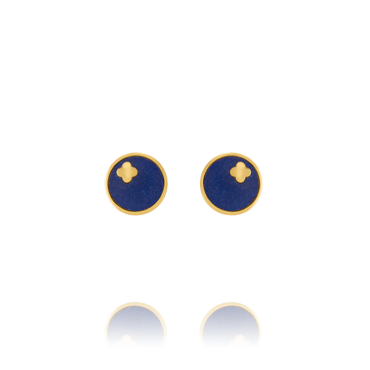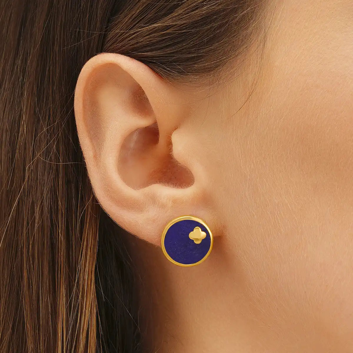 Ces boucles d'oreilles circulaires de la collection Légende sont ornées d'un trèfle doré niché dans un écrin bleu marine, le tout encadré d'argent doré.