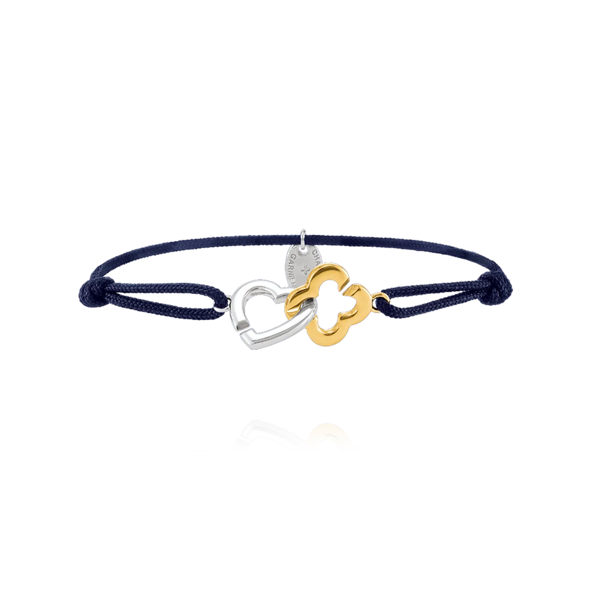 Mêlant argent et doré, ce bracelet de la collection Passion est orné d'un cœur argenté et d'un trèfle doré, le tout suspendu à une cordelette bleue.