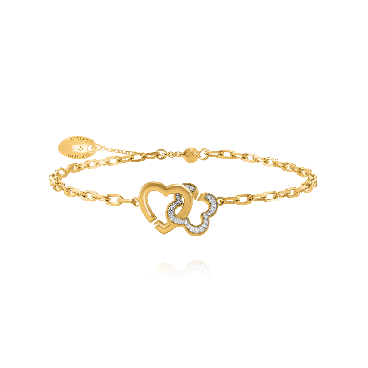 La collection Passion présente ce bracelet doré, où un cœur et un trèfle s'entrelacent dans une danse élégante.