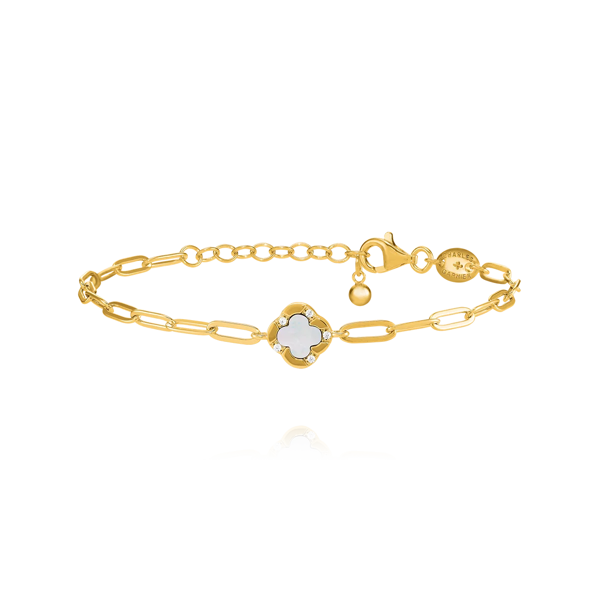 Embellissez votre poignet avec l'éclat du bracelet LÉGENDE, une pièce signature de la marque qui allie grâce et luxe. Ce précieux bijou en argent 925 doré se pare d'un délicat trèfle en nacre blanche, bordé de lumineux oxydes de zirconium, qui captent la lumière. Il apporte raffinement et distinction à votre tenue, révélant une finesse et une féminité exquises.