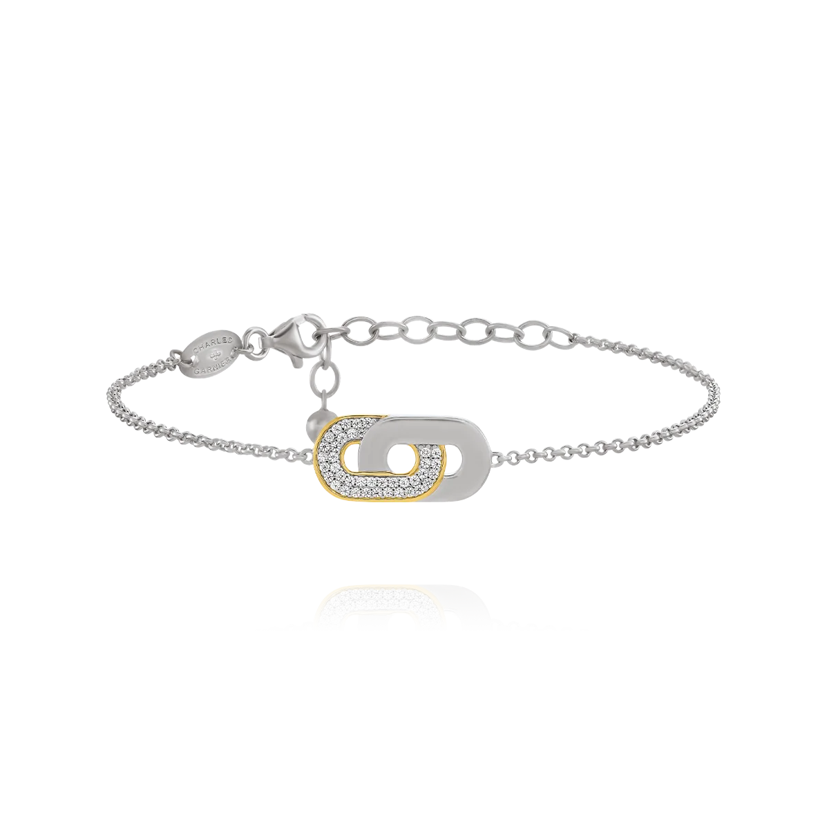 Le Bracelet STYLES est une création qui allie avec brio sophistication et design avant-gardiste. Confectionné en argent 925 bicolore, ce bijou féminin se distingue par ses deux maillons entrelacés, à la fois élégants et harmonieux. Le maillon en argent doré brille subtilement, grâce à l'incrustation d'oxydes de zirconium, apportant une touche d'éclat à votre poignet.