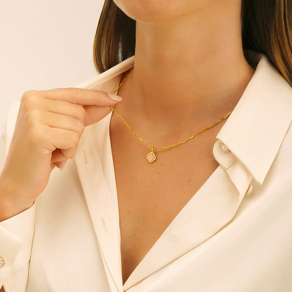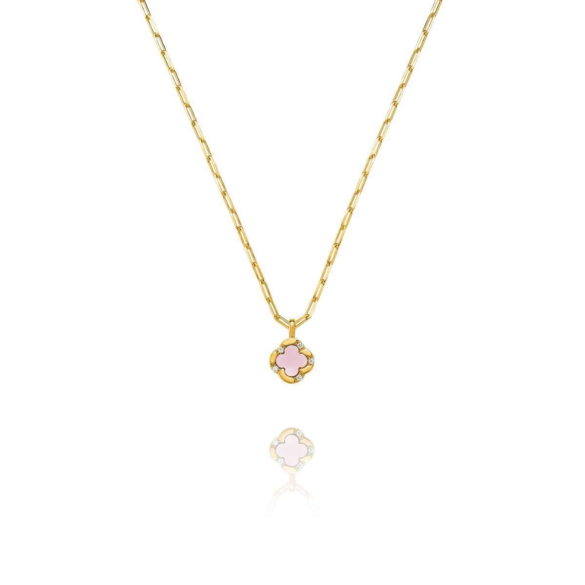 Apportez une touche de douceur à votre style avec le Collier LÉGENDE Trèfle Nacre Rose, une création en argent doré ornée d’oxydes de zirconium et d'un pendentif en forme de trèfle. La nacre rose, pierre délicate et féminine, symbolise la tendresse et l’harmonie. Ce bijou luxueux illumine le décolleté avec une grâce subtile et un éclat raffiné. Le Collier LÉGENDE Trèfle Nacre Rose est un accessoire parfait pour sublimer votre féminité, un cadeau idéal pour la femme moderne en quête de raffinement.
