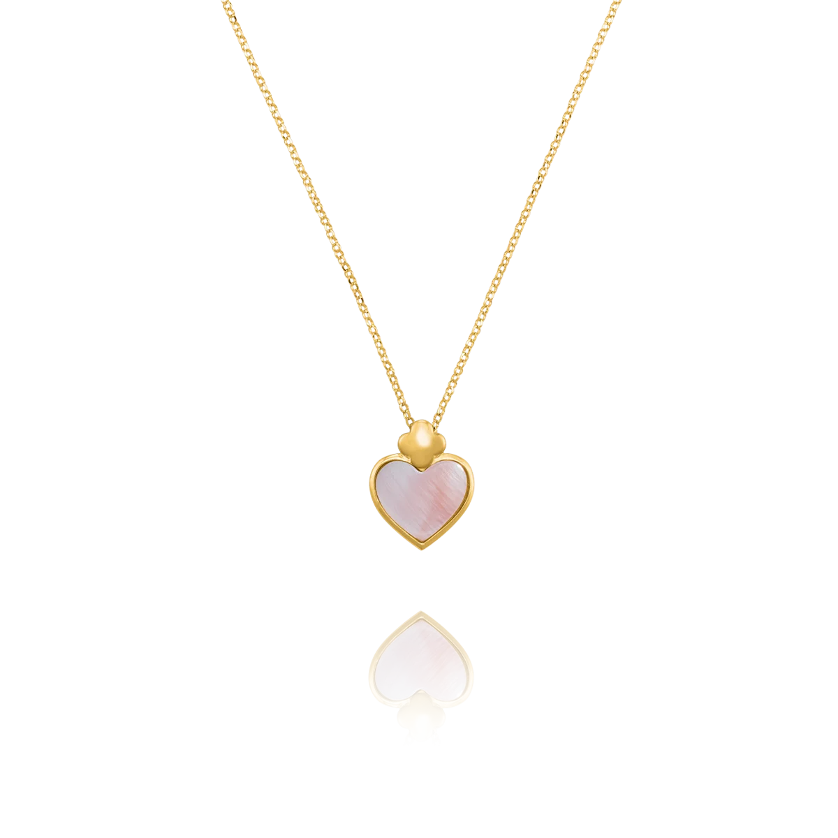 Douceur et romantisme définissent ce collier de la collection Passion, avec un pendentif cœur en nacre rose encadré d'argent doré.