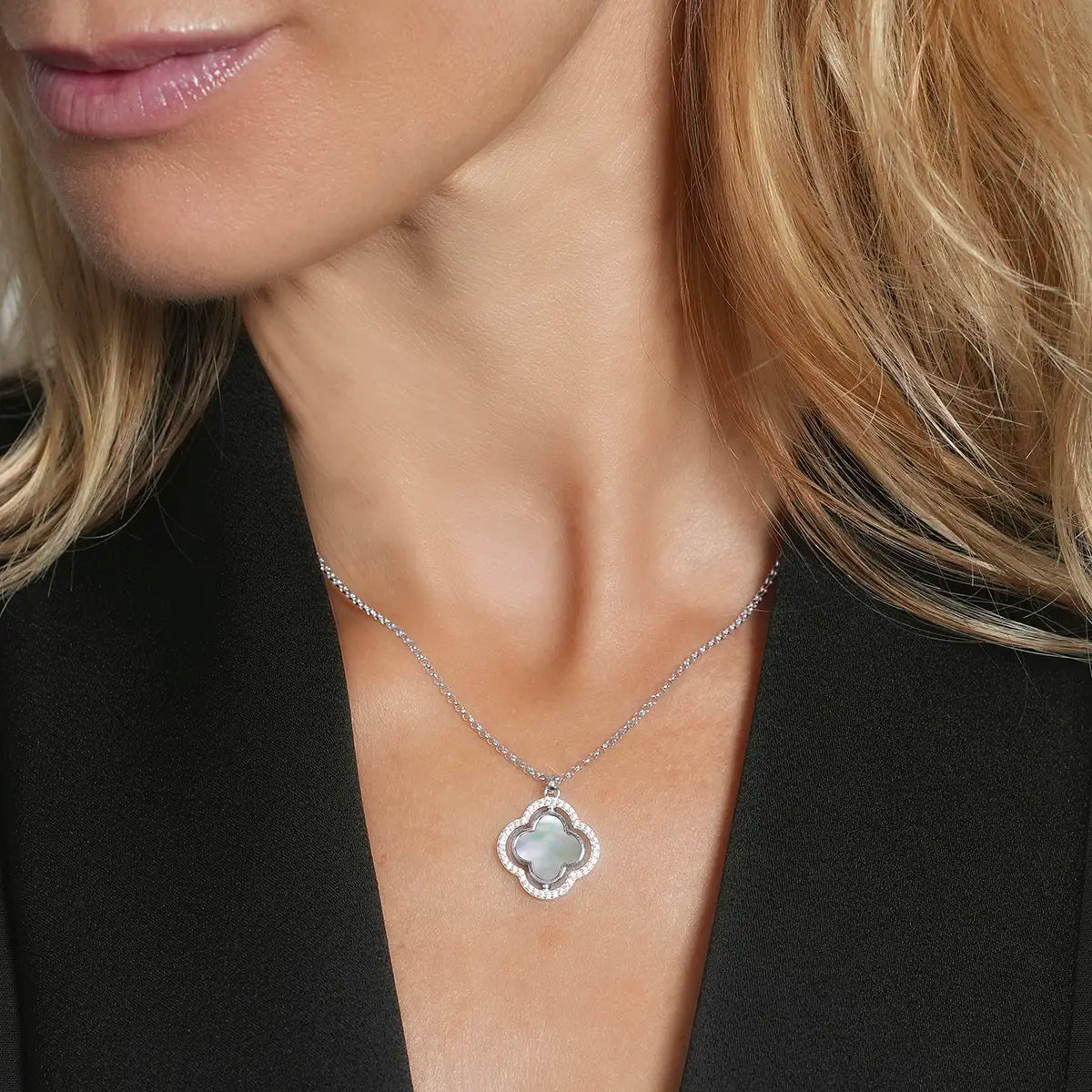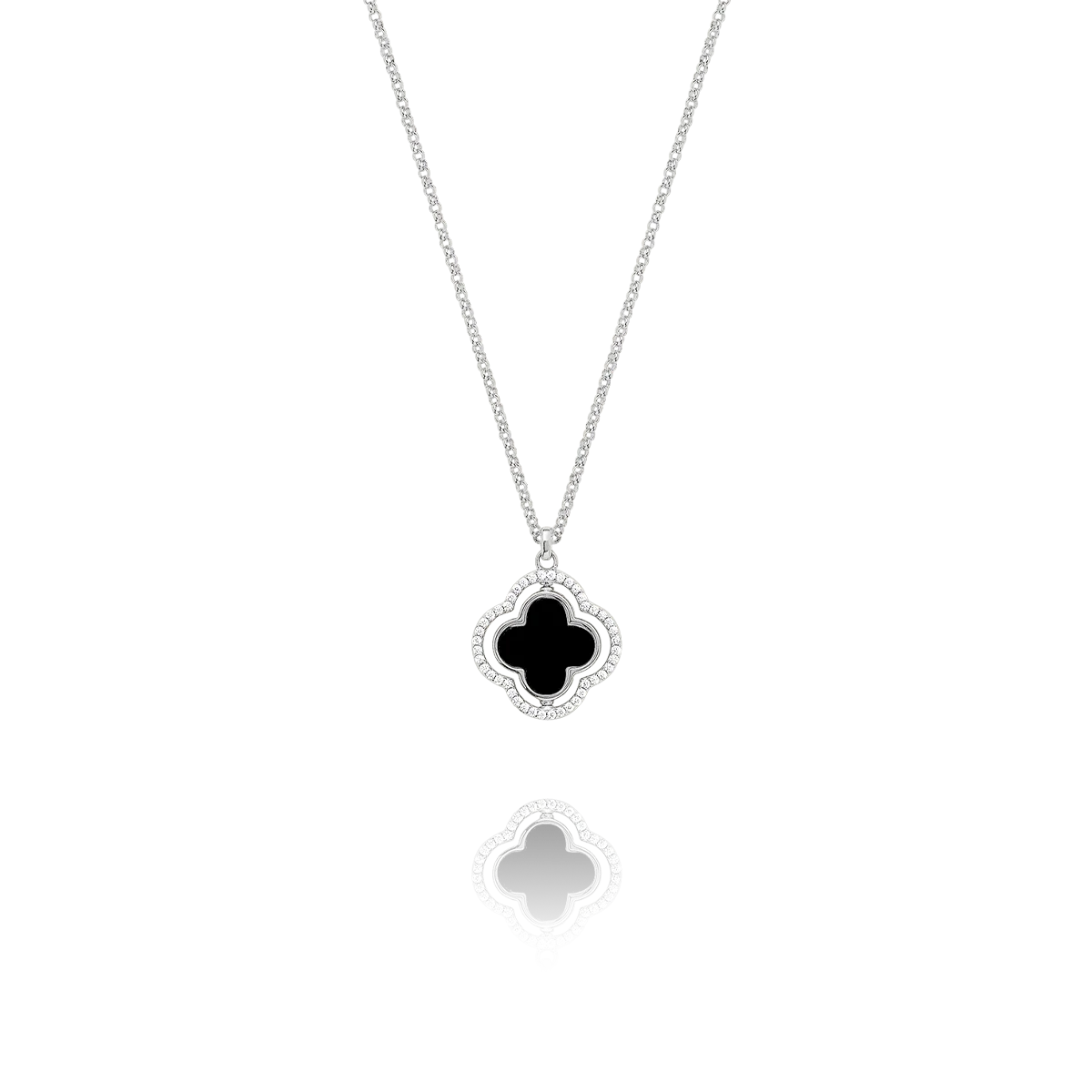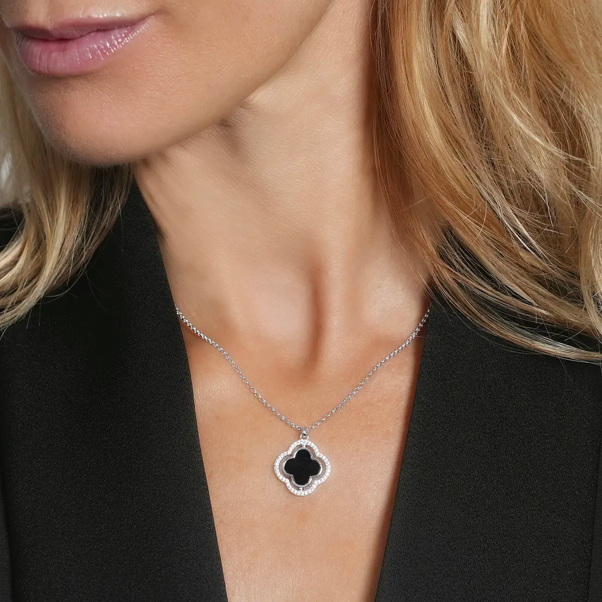 Le contour du trèfle est subtilement serti d'oxydes de zirconium étincelants, apportant une touche de brillance supplémentaire. Grâce à son design ingénieux, ce collier vous permet de changer de style en un instant : optez pour l'éclat de la nacre pour illuminer votre décolleté, ou pour l'élégance sobre de l'onyx noir pour une allure plus graphique.