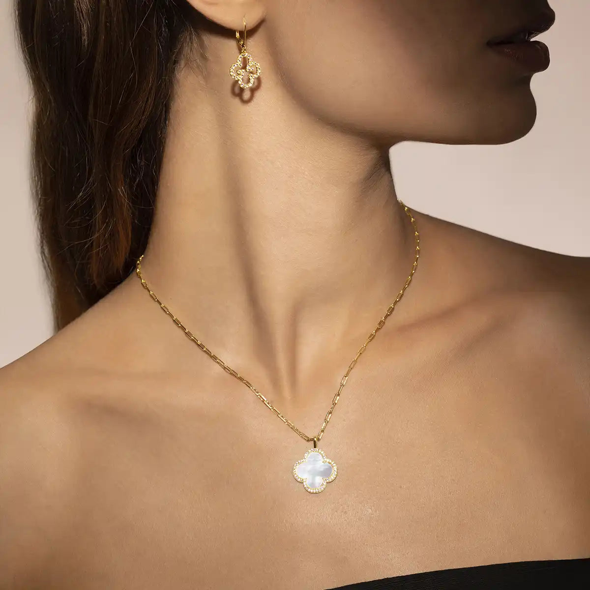 Composé de fins maillons d'argent 925 doré, ce collier présente un pendentif trèfle en agate noire serti d'oxydes de zirconium. Ce motif représente les initiales C et G de la marque. Ce bijou saura vous séduire par sa féminité et son élégance.