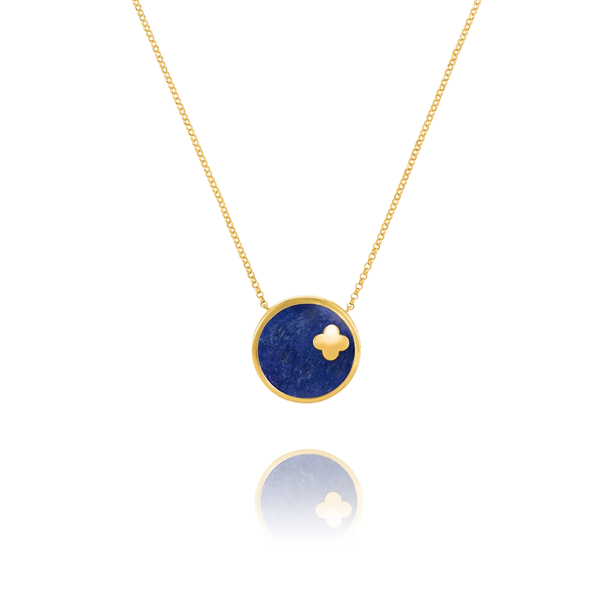 Le collier de la collection Légende brille avec un pendentif circulaire en bleu marine, encadré d'argent doré et centré sur un trèfle doré.
