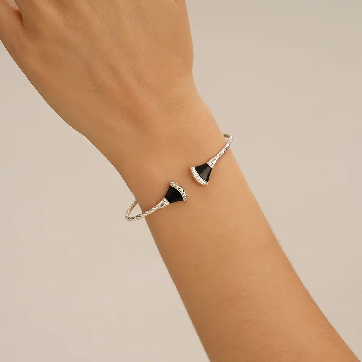 En argent 925 rhodié, ce bracelet jonc ouvert est orné de deux motifs inspirés de la Tour Eiffel. L'agate noire surmontée d'oxydes de zirconium confère à ce bijou une rare distinction.