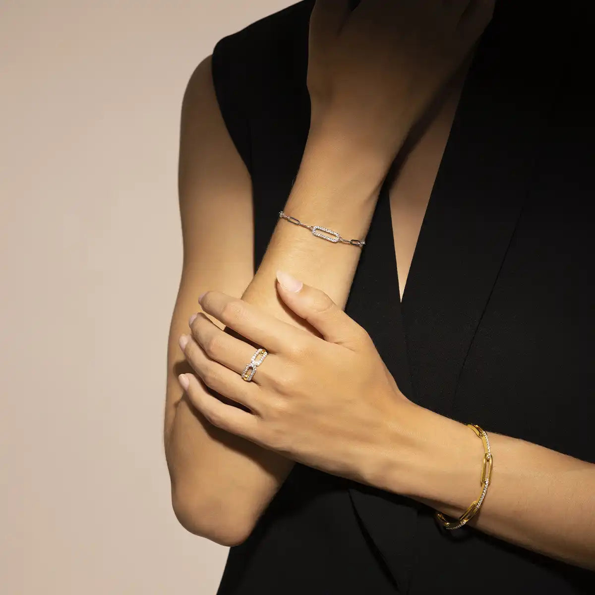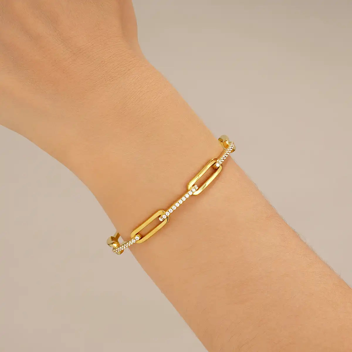 Ce bracelet rigide alterne des maillons allongés liés par une barrette sertie d'oxydes de zirconium. La simplicité de ce bangle ouvert en argent massif 925 offre un design pur et minimaliste.