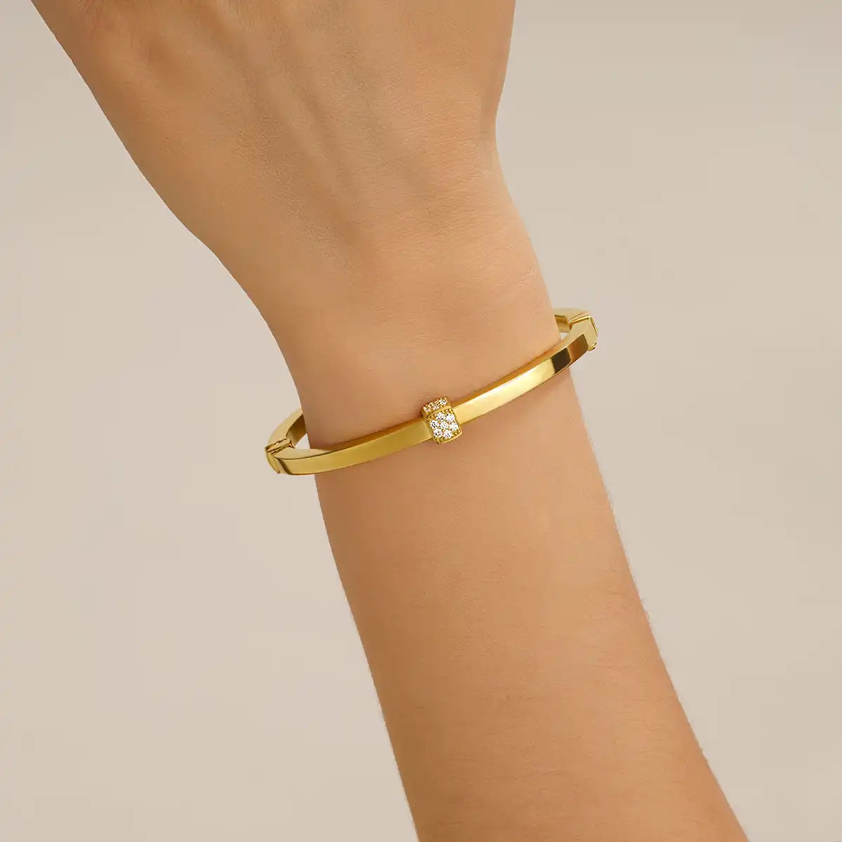 Section carrée pour cet élégant jonc ouvrant en argent 925 doré présentant en son centre un motif serti d'oxydes zirconium.