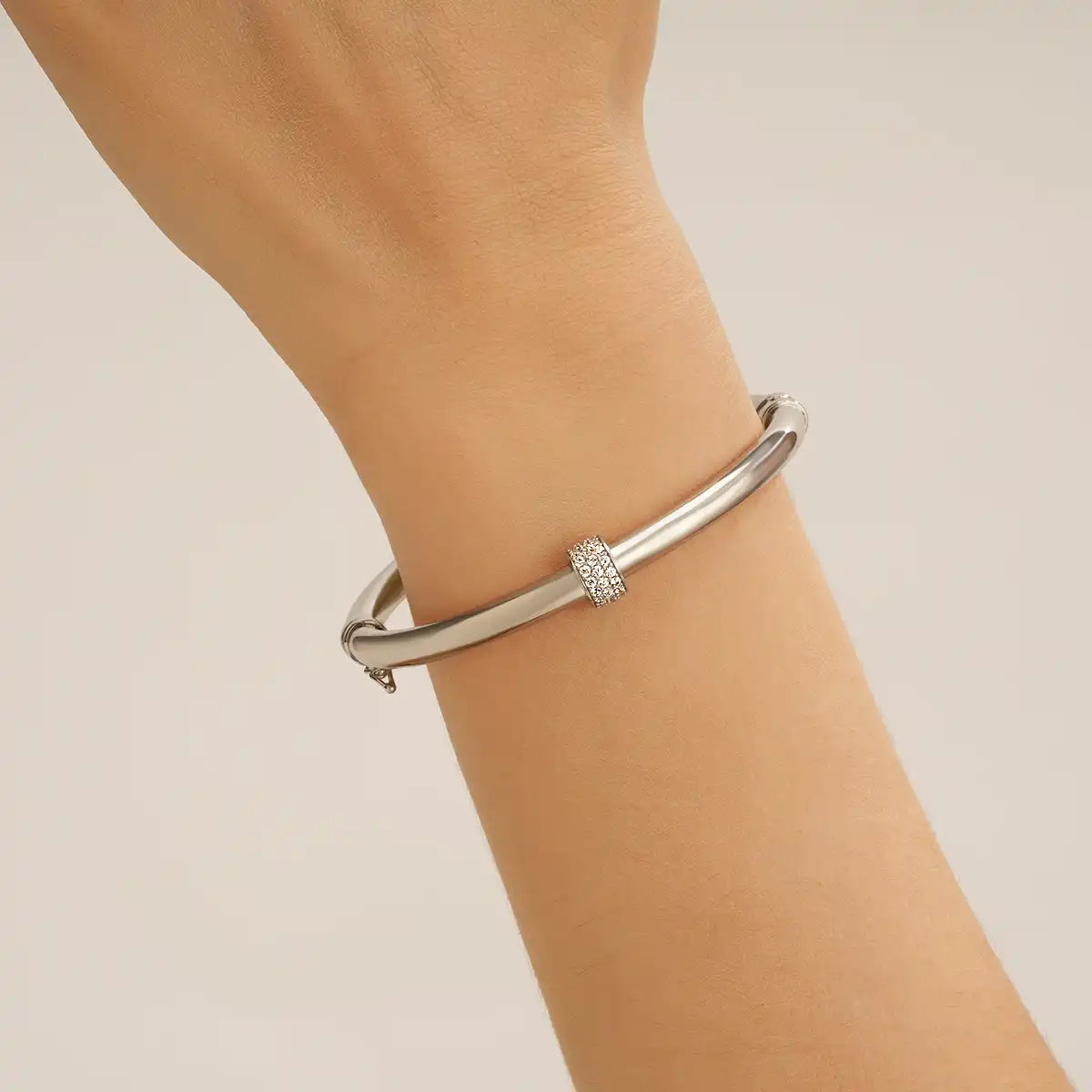 Ce bracelet rigide en argent 925 rhodié est complété d'un anneau serti d'oxydes de zirconium. Elegant et moderne, ce jonc ouvrant apportera une touche de distinction à votre tenue.