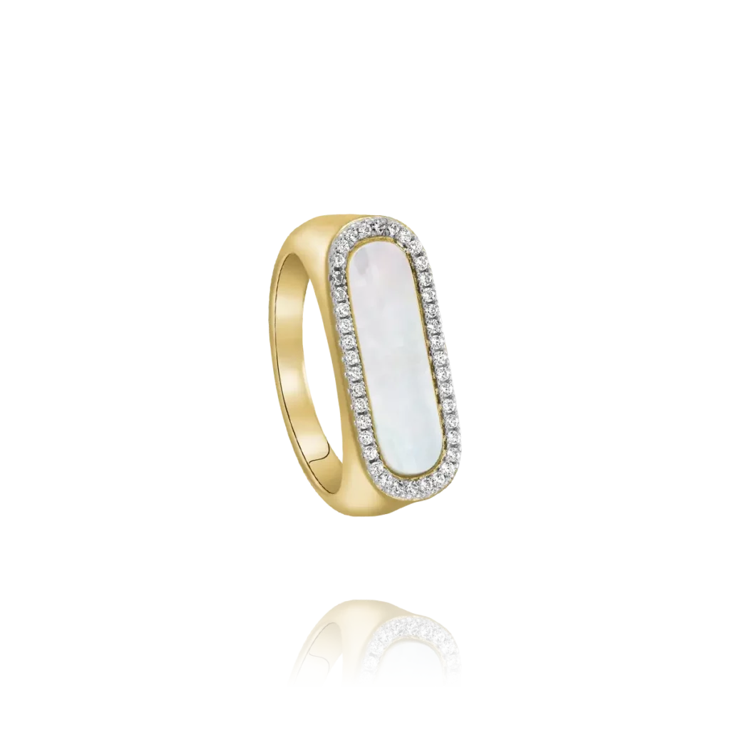 Cette bague en argent 925 doré est ornée d’un élégant maillon en nacre entouré d’oxydes de zirconium. La nacre s’harmonise parfaitement au doré du bijou. Une touche d’élégance pour tous les jours.