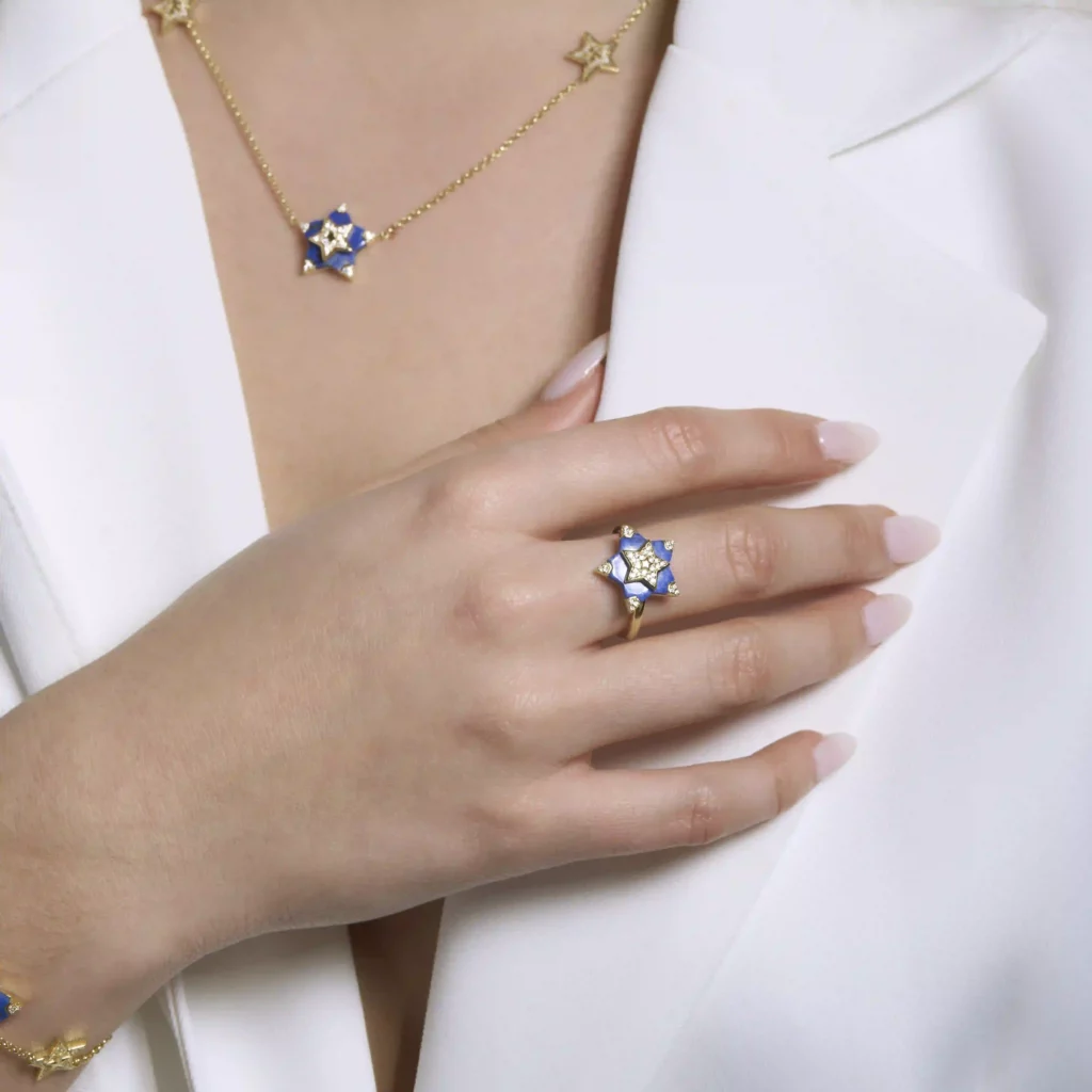 Succombez à l’intensité colorée de la Bague LÉGENDE Étoile Bleue, un bijou qui allie mystère et éclat. Son étoile en Argent doré, ornée de lapis-lazuli, dévoile un bleu profond et fascinant, sublimé par l’éclat des oxydes de zirconium. Inspirée par la magie céleste, cette bague évoque la puissance des étoiles et le mystère du cosmos.