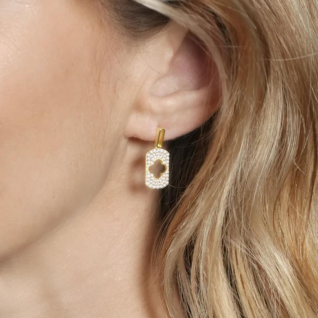Captivez le regard avec les Boucles d’oreilles LÉGENDE de Charles Garnier Paris, une création lumineuse qui allie modernité et symbolisme. Ces élégantes boucles d’oreilles pendantes sont dotées d’une plaque rectangulaire en argent, intégralement sertie d’oxydes de zirconium scintillants qui irradient de mille feux. Au centre de cette plaque éclatante, une découpe délicate en forme de trèfle apporte une touche de légèreté et un clin d’œil discret à la chance.