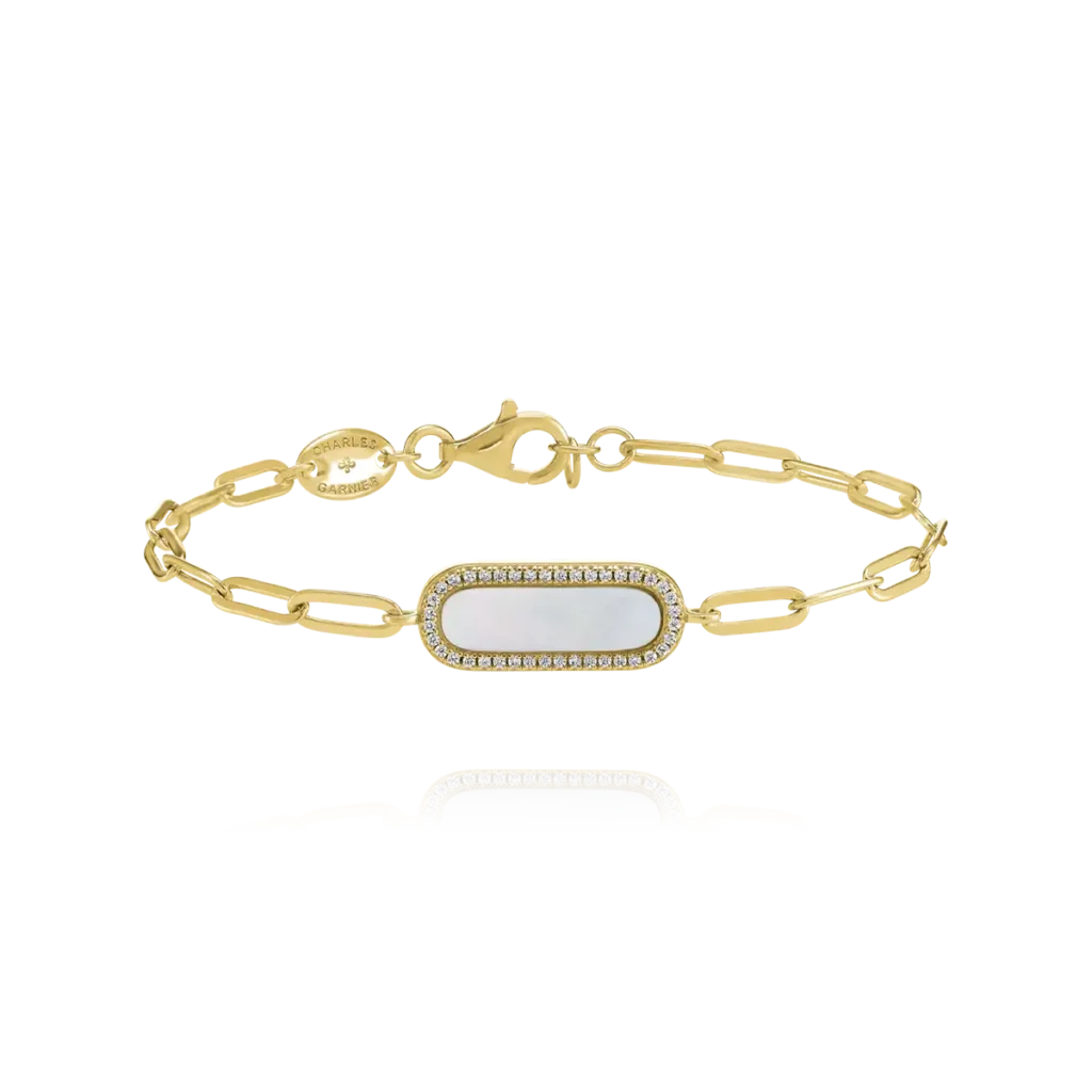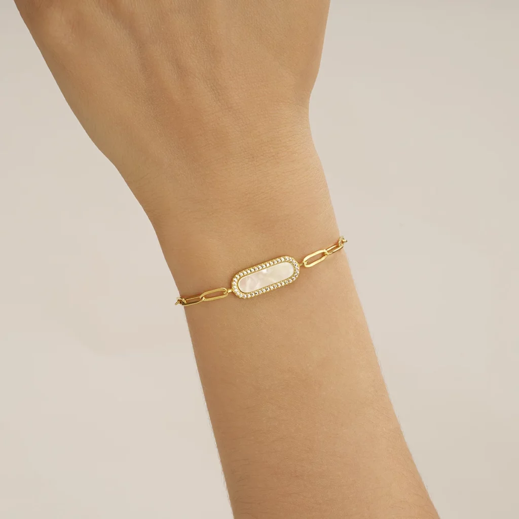 Ce bracelet en argent doré possède de fins maillons et un long maillon en nacre serti d’oxydes de zirconium. Ce bijou saura vous séduire par son style élégant et moderne.