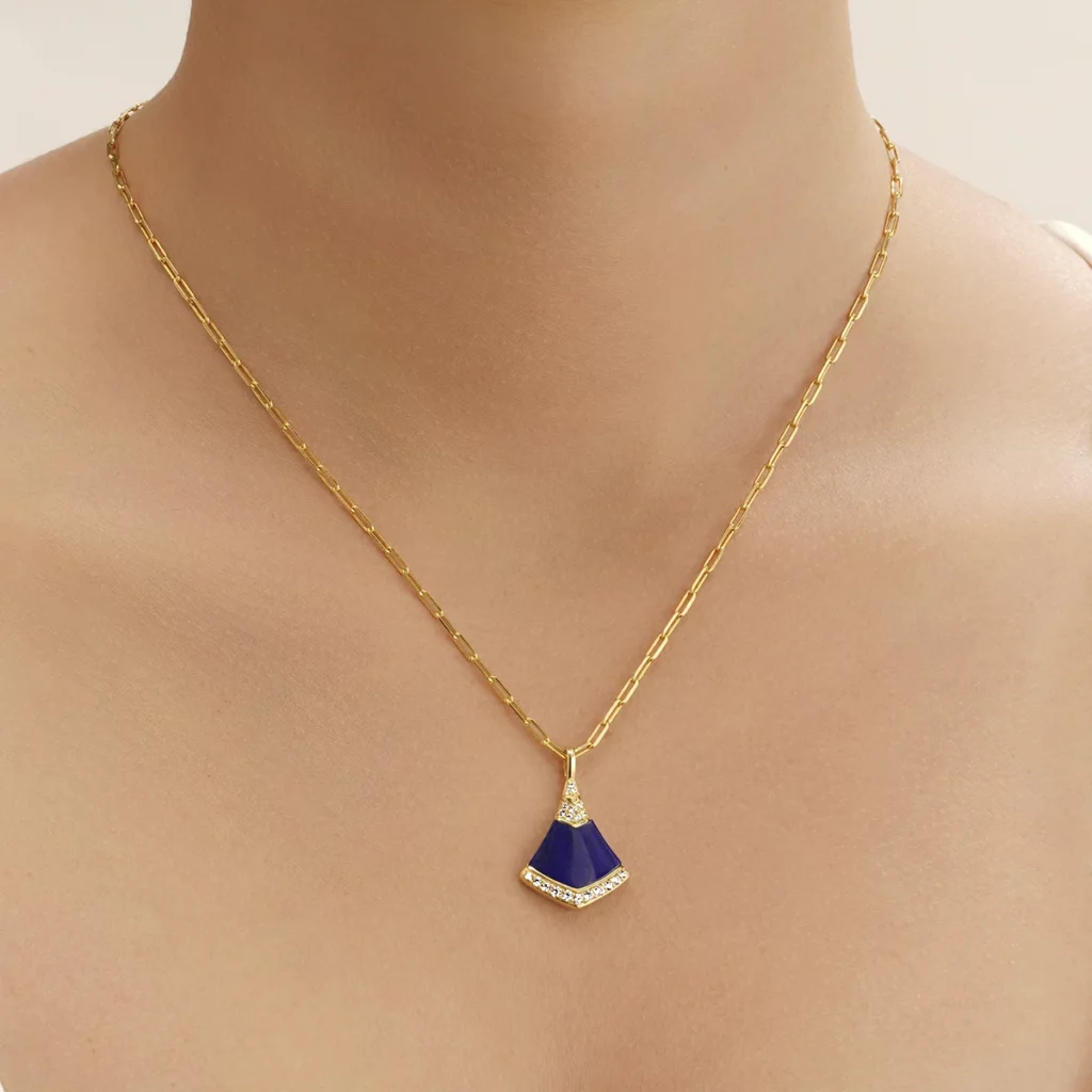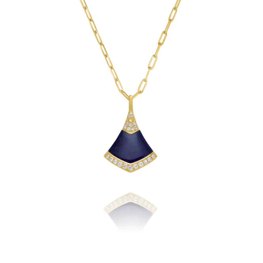 Alliance parfaite de l’argent 925 doré, du lapis-lazuli et des oxydes de zirconium, ce pendentif aux allures de Tour Eiffel donnent au collier un aspect joaillier.