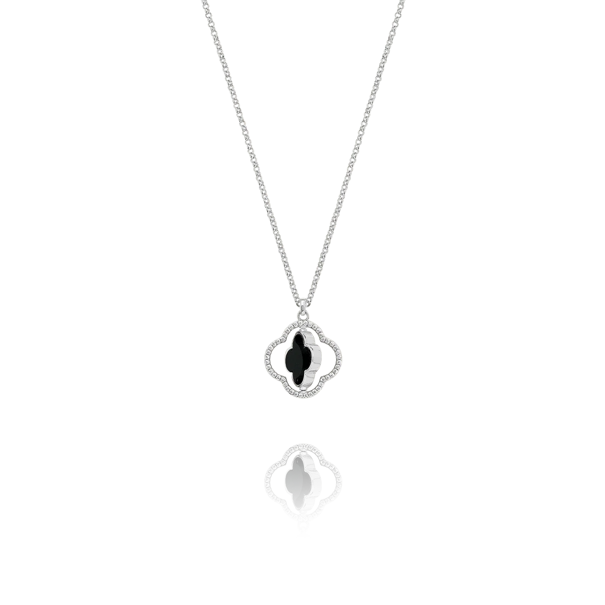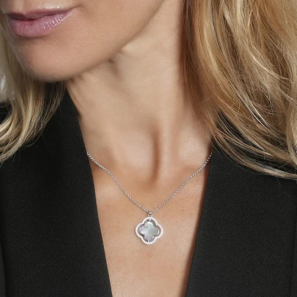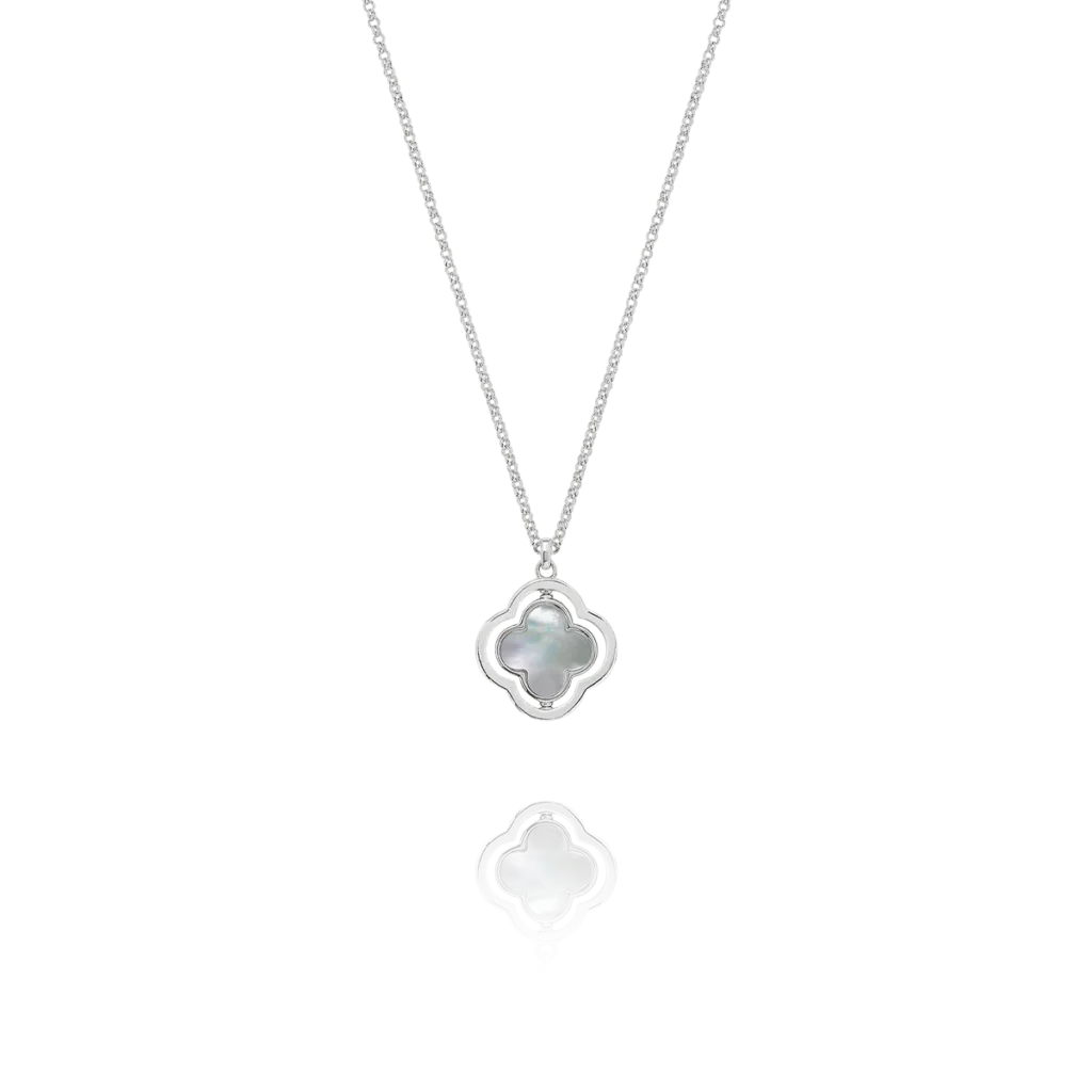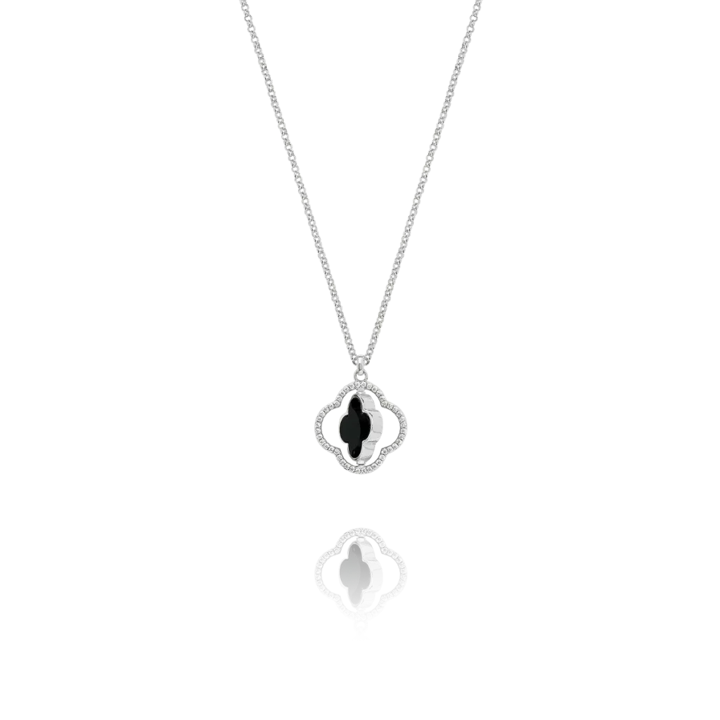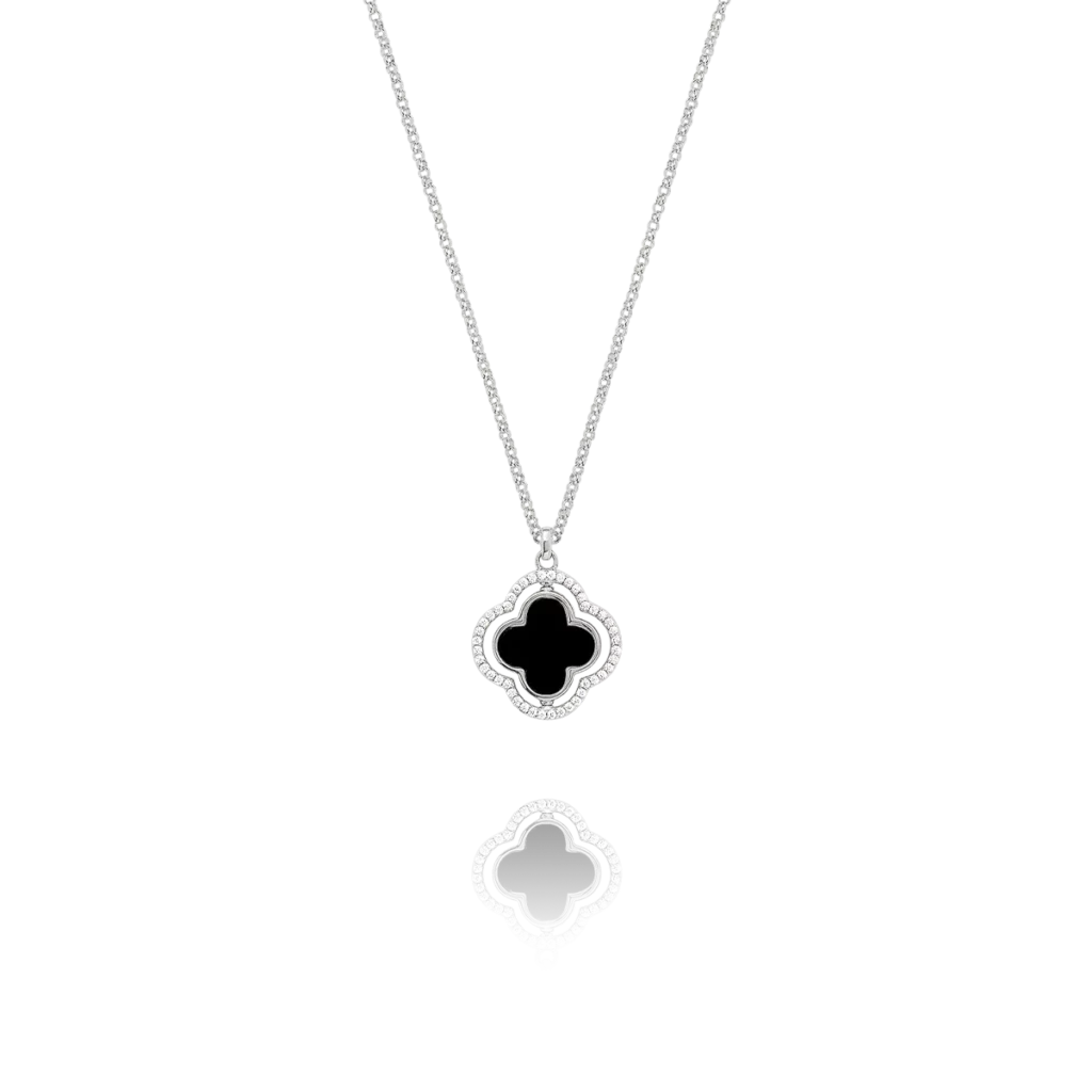 Le contour du trèfle est subtilement serti d’oxydes de zirconium étincelants, apportant une touche de brillance supplémentaire. Grâce à son design ingénieux, ce collier vous permet de changer de style en un instant : optez pour l’éclat de la nacre pour illuminer votre décolleté, ou pour l’élégance sobre de l’onyx noir pour une allure plus graphique.
