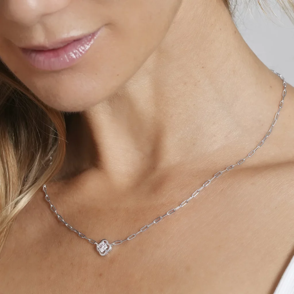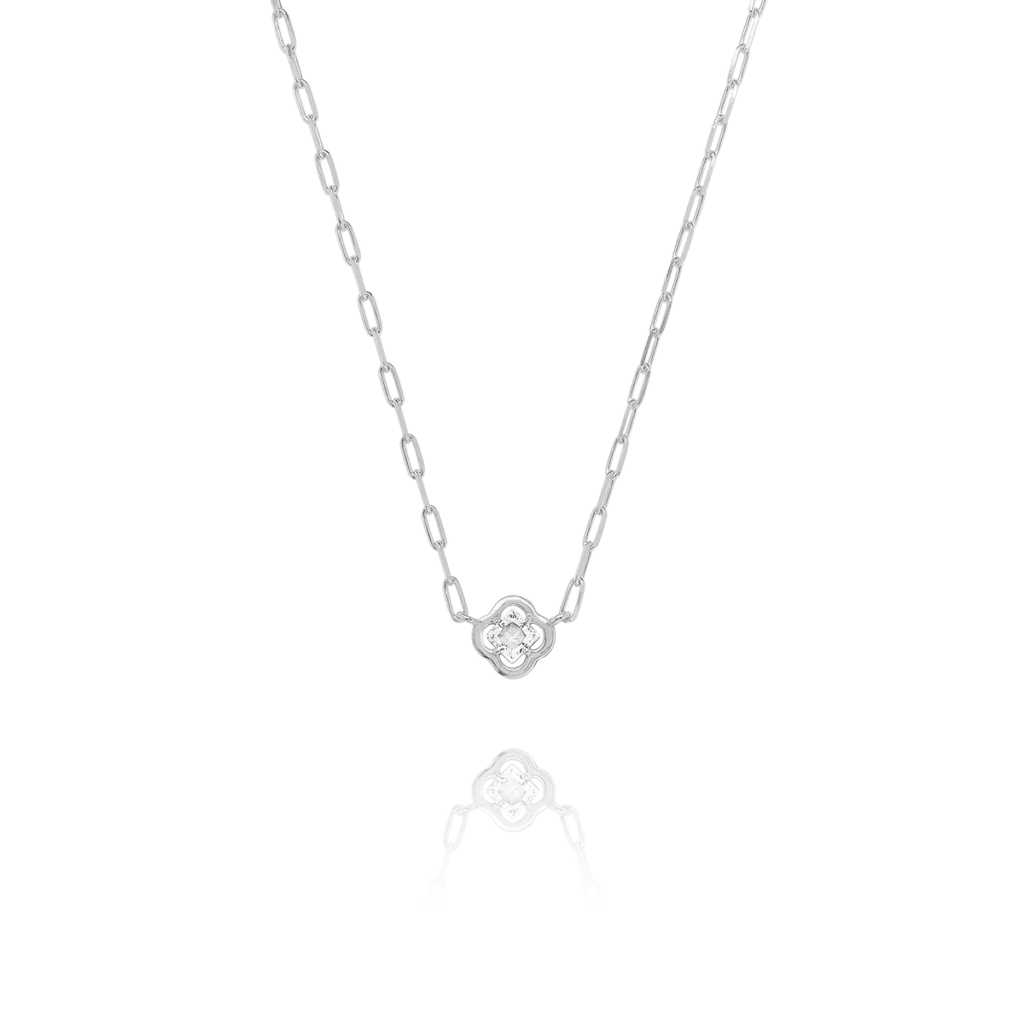 Affichez une élégance lumineuse avec le collier solitaire LÉGENDE en argent 925 signé Charles Garnier Paris. Son motif trèfle ajouré, délicatement travaillé, est sublimé par une zircone solitaire en son centre, offrant un éclat raffiné et discret.